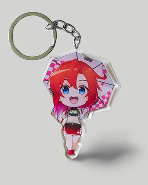 Chibi Chains! Our collectible limited production run of anime oc keychains that feature a uniquely themed artwork of Imouri-Chan released every month. This listing is for: Number 40, "Race Queen". Imouri-Chan is here to keep the pit crew cool and her race team racers at peak energy levels!