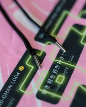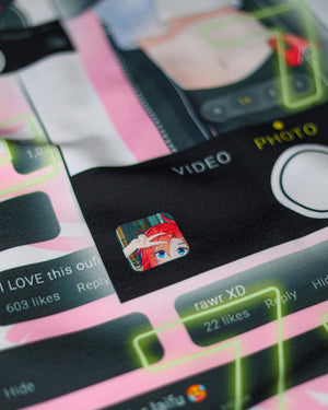 Our fully sublimated, all-over print Comments Hoodie features in-your-face design language depicting modern social media and the followings that can amass quickly for all of the anime idols out there online. You'll find elements of a smartphone camera inserted into the design as Imouri-Chan poses for her next post on the back side print.