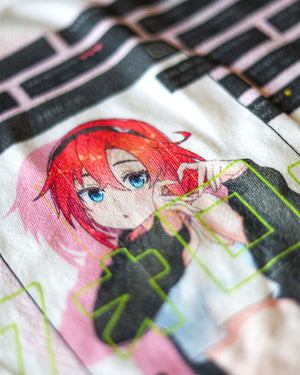 Our Comments T-Shirt features in-your-face design language depicting modern social media and the followings that can amass quickly for anime idols online. You'll find elements of a smartphone camera inserted into the design as Imouri-Chan poses for her next post on the back side print.