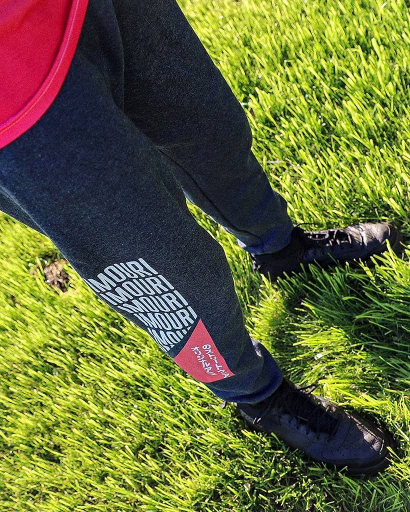 Complete the look. Imouri Joggers are here. Textured Heather Black fabric base featuring our signature repeating text and Original Anime Streetwear slogan printed in full resolution on both left and right sides.