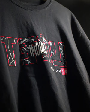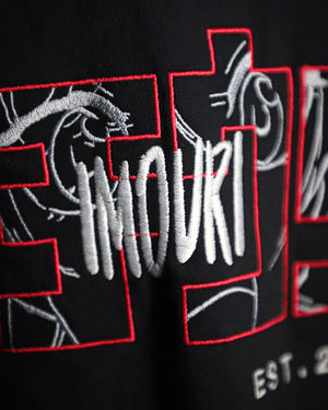 Our OC T-Shirt is a premium heavyweight boxy fit blank with a 10" wide 3 color embroidered design of custom block font Katakana with Imouri-Chan overlayed into the text.