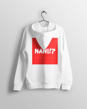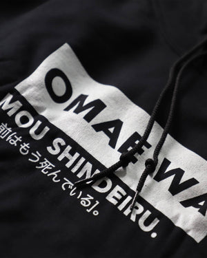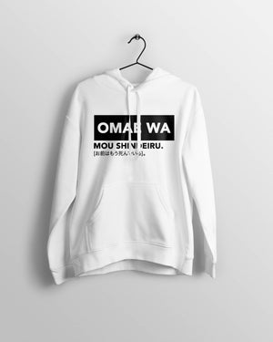 Omae wa mou shindeiru. "You're already dead." Flip the hoodie over to the back and you'll see, "NANI!?" in bold text.