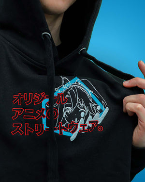 Inspired by the draft phase that any Anime goes through in its production. Chest features an 8" wide embroidered section using the blue color seen in storyboards. The original rough sketch of our "Best Girl" Ver. Imouri-Chan is layered over our signature logo and motto written in Japanese: Original Anime Streetwear.