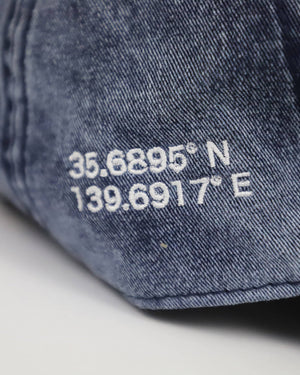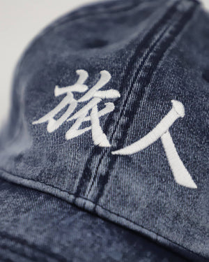Vintage worn denim hat that looks like it's traveled a million miles already. Take it on some more adventures. Coordinates on the right side are for Tokyo. Front kanji translates to, "Traveler."